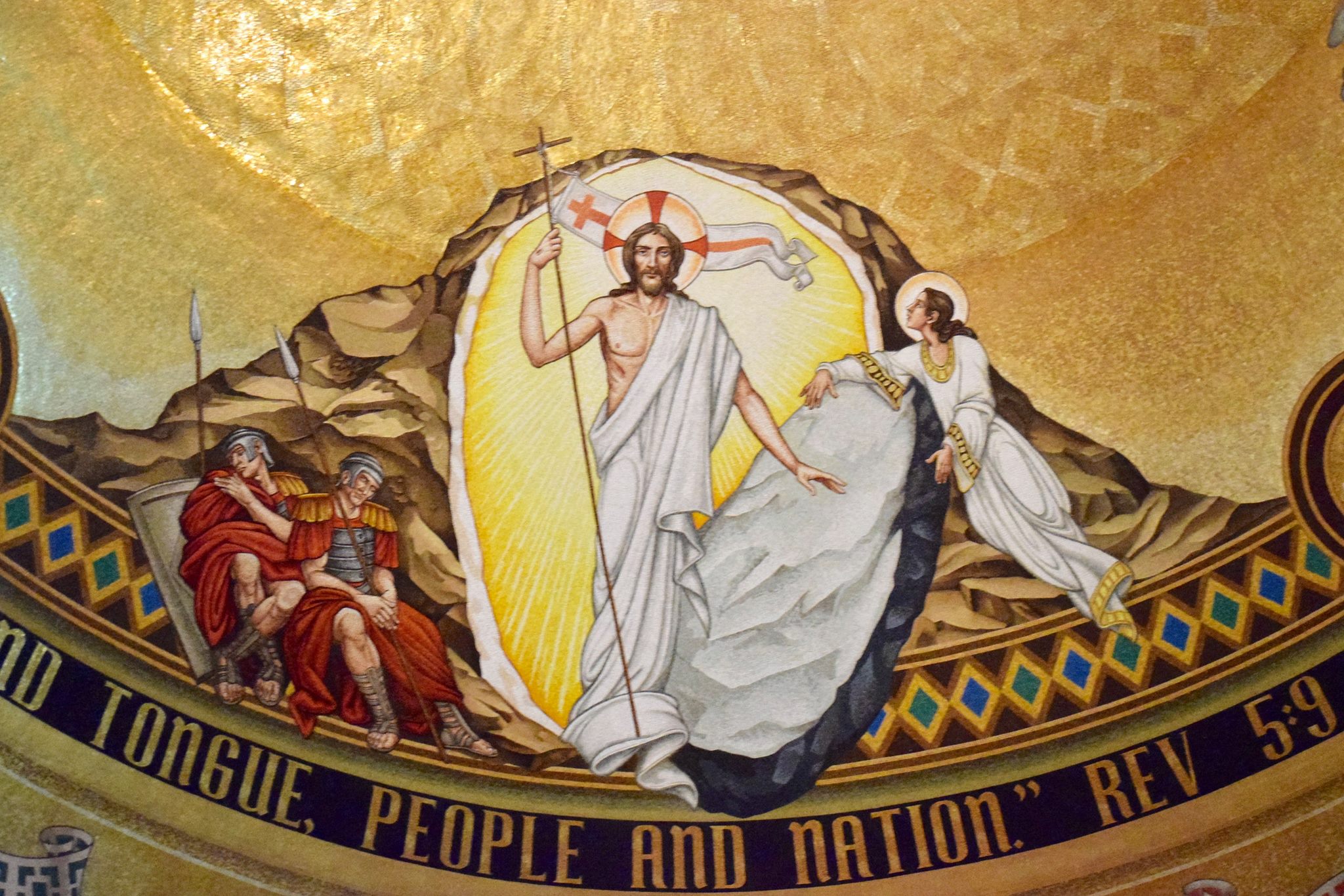 Spanning 3,780 square feet, the Redemption Dome has four different sections which each depict a different redemptive act of Jesus: the Crucifixion, the Descent into Hell, the Temptation in the Desert, and the Resurrection. As the culminating moment of the piece, this portrayal of the Resurrection evokes a sense of awe and triumph. Jesus is shown surrounded by golden light, crowned with an aureole and victoriously holding a banner with St. George’s Cross, while the Roman guards slumber at His feet. At the entrance of the tomb, the angel rolls away the stone, just as Jesus through His death removed the barrier between us and the Father forever.