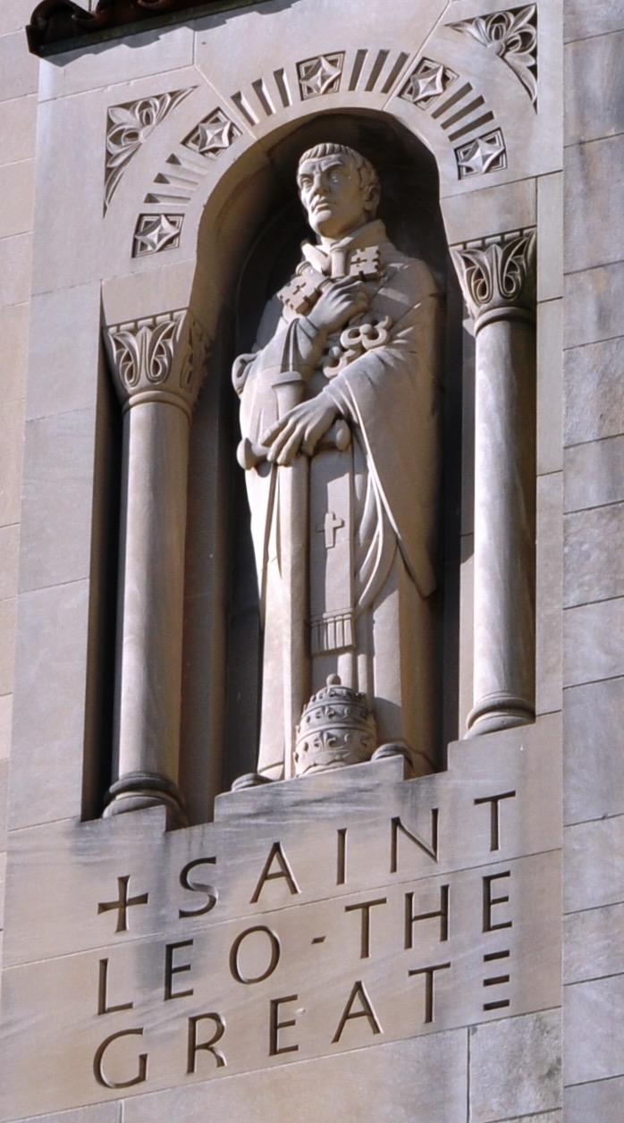 On November 10, we celebrate the feast day of Saint Leo the Great, a dedicated theologian and leader of the Church, and a firm believer in the Primacy of the Roman Church. Today, we invite you to learn about how he helped resolve some significant divisions within the Church and clarified key doctrines regarding Christ’s incarnation. He is portrayed in the East Façade of the Basilica.