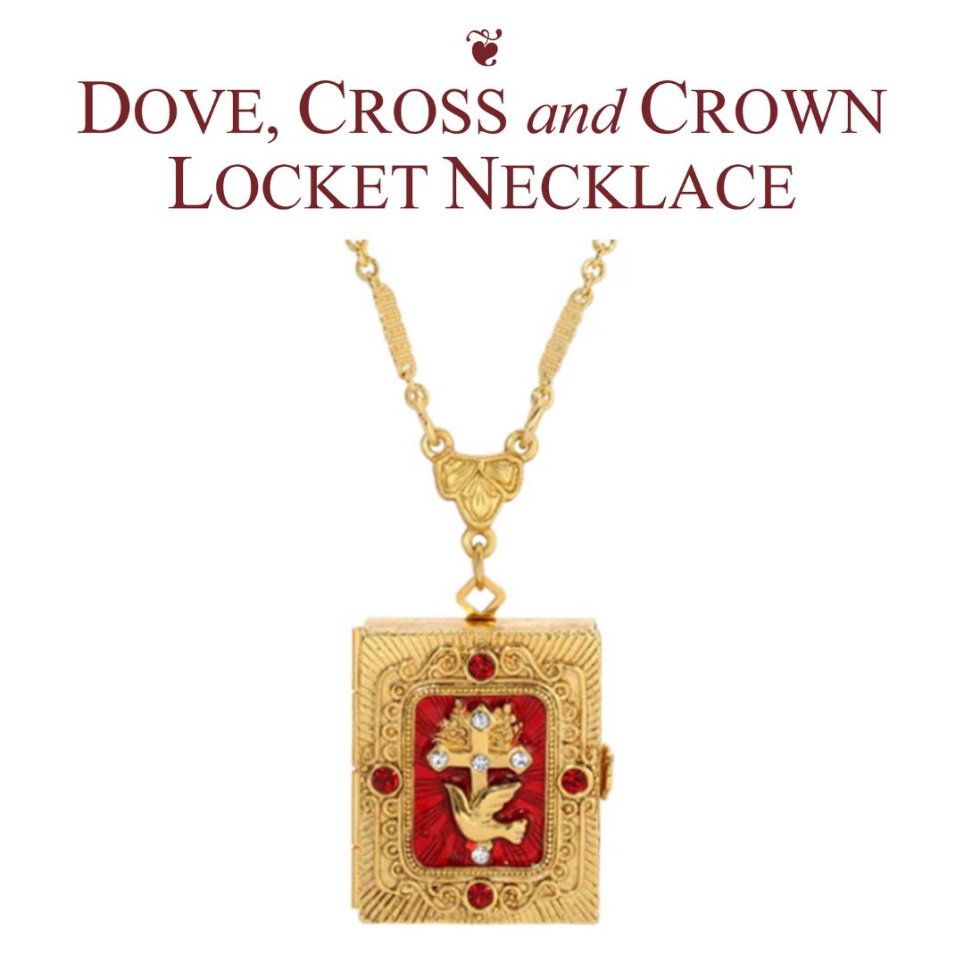 Designed and crafted in the USA, this vintage-style locket features a dove, a cross, and a crown. A filigree frame dotted with petite red gemstones surrounds a red enamel center, while accent crystals highlight the cross. Measuring 28 inches long, a decorative gold chain perfectly completes this piece of timeless devotional jewelry.