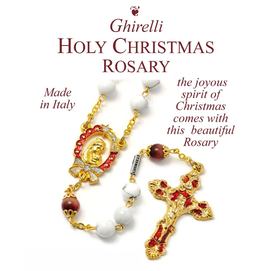 Created by Ghirelli in Italy, this antique-style gold-plated rosary was designed exclusively for the Christmas season. Linked with 8mm Bohemian glass beads, it features a medallion portraying Mary embracing the Infant Jesus that is framed by Christmas symbols, including the Star of Bethlehem. With its hand-enameled inserts and Baroque-style crucifix, this rosary would make a wonderful gift.