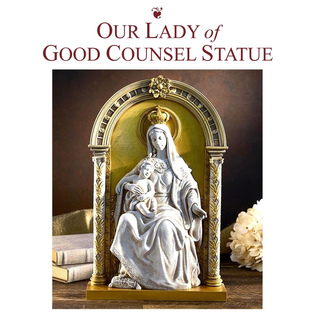 Sculpted from resin, this breathtaking statue depicts the Madonna and Child in vivid detail. Framed by an intricate, gilded arch, the two rest in front of a bright gold backdrop that beautifully highlights their serene figures, creating a focal point of reverence and grace. The statue includes a built-in pedestal and measures 14 inches tall.