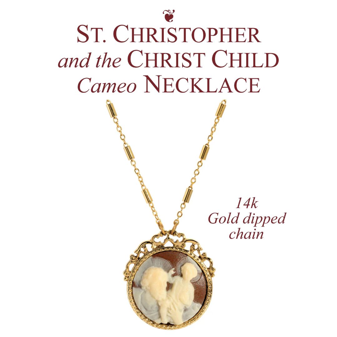 Resting at the center of this stunning necklace is a brown and ivory cameo pendant depicting Saint Christopher and the Christ Child. Made with a 14k gold dipped chain with bead accents, the necklace is 26 inches long and would make a perfect gift for a mother, daughter, or friend!