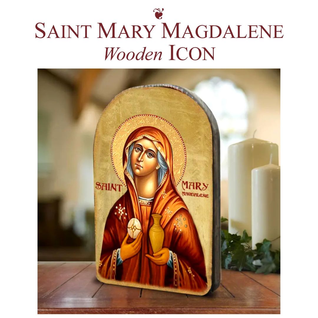 Elevate any sacred space with this handcrafted wooden icon. Crafted in the USA, it features a painting of Saint Mary Magdalene in dazzling red and orange hues and is made with real gold leaf plating for a radiant finish. With its old-world charm, it would make an excellent addition to your home or prayer corner. The icon measures approximately 6 x 4 inches and includes wall mounting hardware for easy installation.