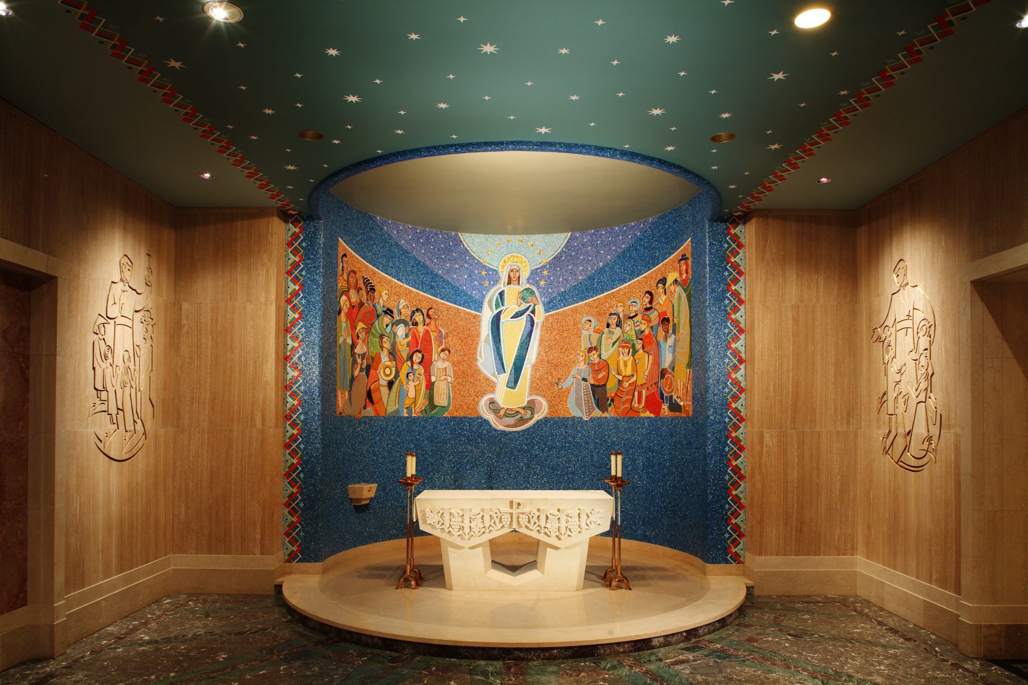 This chapel features a brilliant Venetian glass mosaic depicting Mary crowned with twelve stars, holding a globe surmounted by a cross, with the moon and the serpent beneath her feet (Revelation 12:1). She is surrounded by men and women from the various continents and cultures evangelized by the Oblates of Mary Immaculate (OMI), including the Asian-Pacific, South America, and the Arctic Circle. Travertine marble walls carry incised figures of Oblate preachers, the north wall is a panel of Portasanta marble with a rondel bearing the Oblate seal and motto, and a mission cross of the Oblates is in the center of the altar. The inscription in the chapel is taken from the writings of Saint Eugene de Mazenod, “They will always look upon her as their mother.”